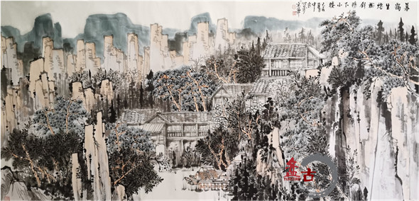 《暮靄生煙樹(shù),斜陽(yáng)下小樓》240X80cm(2019年)私企企業(yè)家收藏