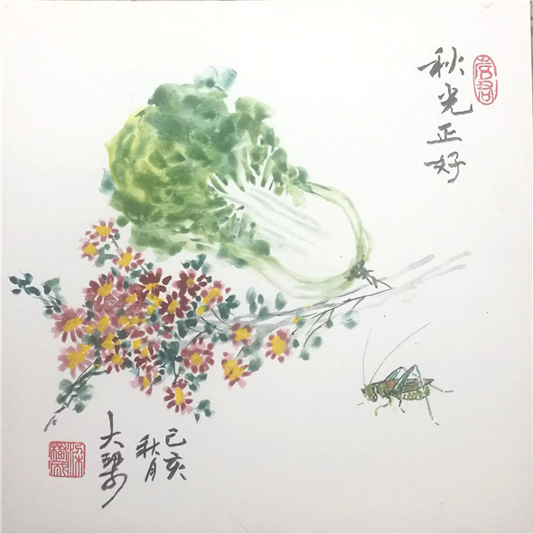 說到《清白圖》大梁先生介紹說,中國畫總有些畫外之音,尤其民間傳統(tǒng),以諧音、象征、寓意等等手法表達(dá)人們對(duì)美好愿景的祈盼與心里暗示。事隨時(shí)移,總有變化,但更多的是萬變不離其宗。畫白菜一直寓兩種意愿,一則寓百財(cái),二則寓清白。這清白,更多文人情懷,做人清清白白,當(dāng)官更該如此,律己亦誨人。